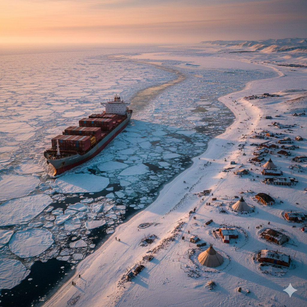 북극경제신문 - 2026년 2월 9일 얼음 위의 항로를 넘어 사람 위의 북극정책으로 손예령 ▲ 이 이미지는 거대 산업 항로와 북극 원주민의 삶의 터전이 만나는 접점을 시각화하여, 차가운 얼음 길을 넘어 '사람'을 향하는 따뜻하고 포용적인 북극 정책의 비전을 담고 있습니다. 거친 쇄빙 항로와 평화로운 원주민 마을의 대비를...