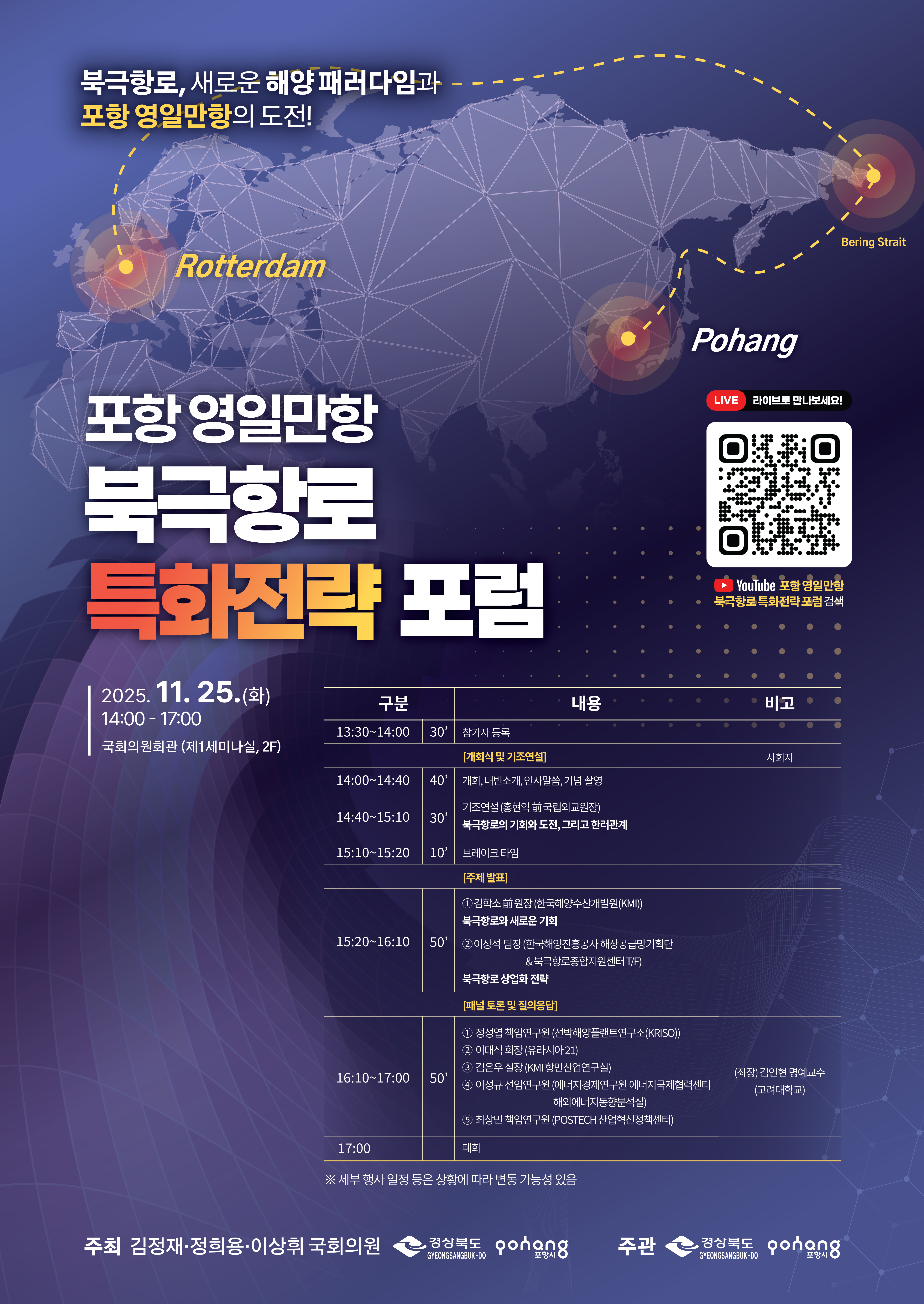 북극경제신문 - 2025년 11월 29일 국회에서 펼쳐진 포항의 북극 도전 11월 25일 오후 2시, 국회의원회관 제1세미나실. 250여 명의 산·학·연·관 전문가들이 모여든 현장은 북극항로에 대한 열기로 가득했다. 김정재(포항 북구)·정희용(고령·성주·칠곡)·이상휘(포항 남구·울릉) 국회의원과 경상북도, 포항시가 공동 주...