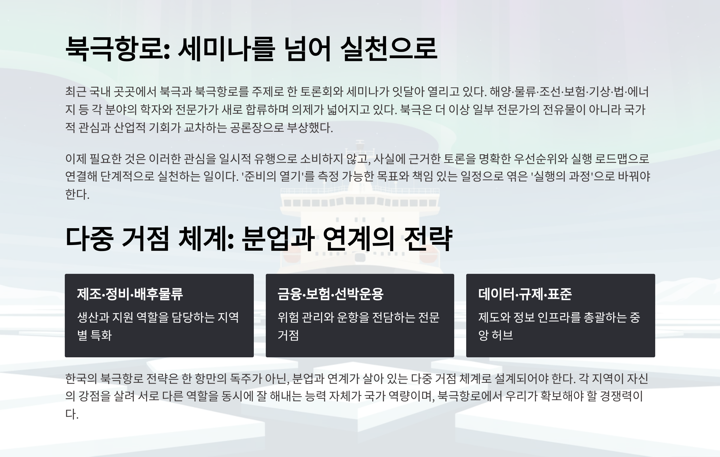 북극항로, 세미나를 넘어 실천으로 다중 거점 체계와 역할 분담 최근 국내 곳곳에서 북극과 북극항로를 주제로 한 토론회와 세미나가 잇달아 열리고 있다. 이는 북극 진출을 위한 고무적인 변화다. 무엇보다 그동안 소극적이던 논의의 장에 해양·물류·조선·보험·기상·법·에너지 등 각 분야의 학자와 전문가가 새로 합류...